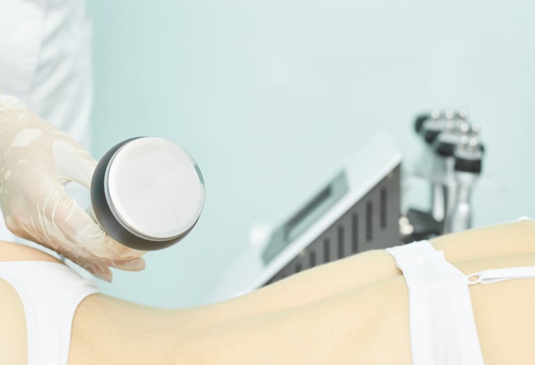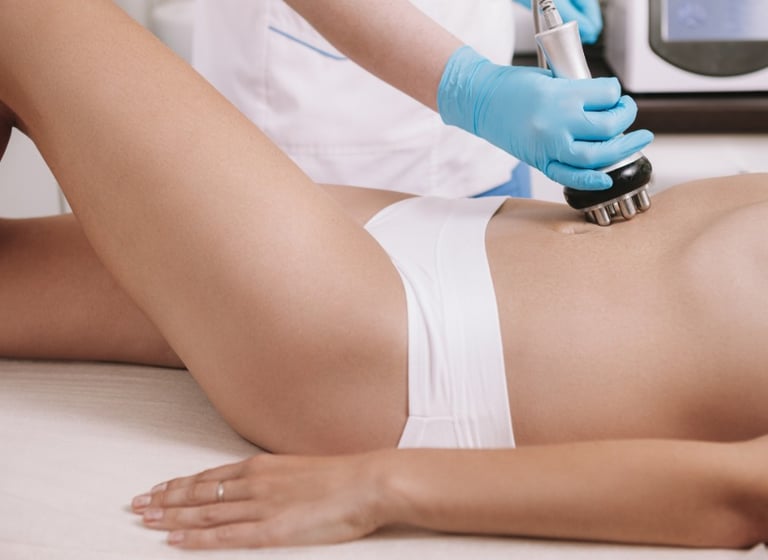 Ultrasonic cavitation is a non-invasive aesthetic procedure that uses low-frequency ultrasound waves to break down fat cells in targeted areas of the body. It is ideal for body contouring, reducing localized fat deposits, and improving skin tone.